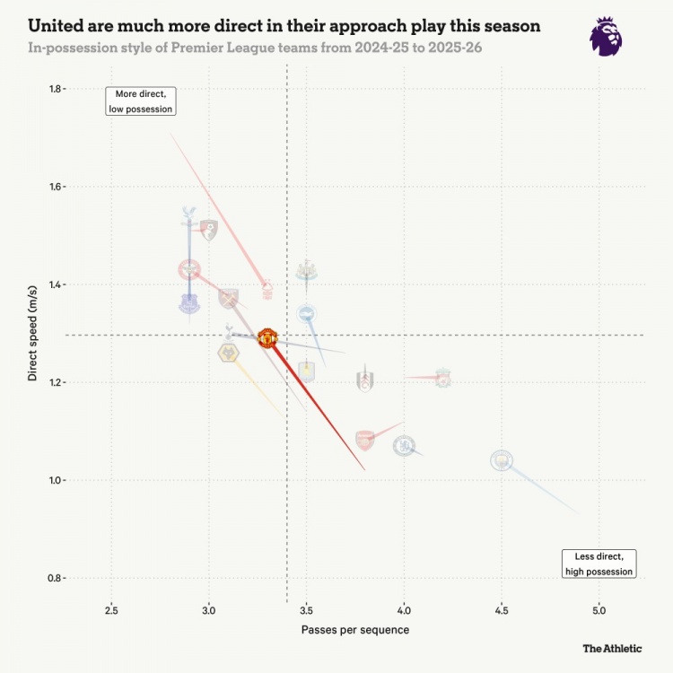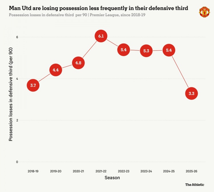 随着赛季深入,这毛病确实好多了,场均后场丢球权降到了3.3次。一方面是球员更熟了,另一方面也是战术变得更直接。曼联减少了让对手高位逼抢得手的机会,放弃了磨叽的传控,选择更干脆的向前。