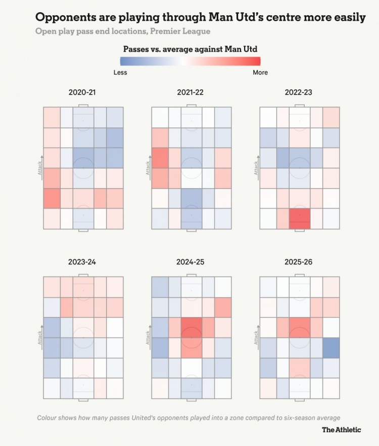 下面的球场热图,对比了对手对阵曼联时,往不同区域传球的百分比和曼联过去六个赛季的平均值。中路那片暖色,就是软肋所在。