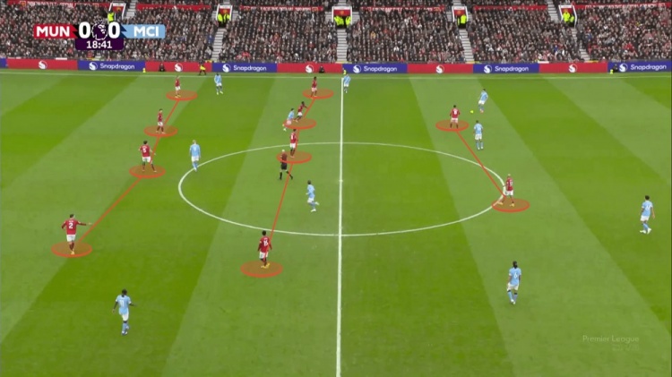 这套“梅努上顶,卡塞米罗横移保护”的动态防守,既限制了罗德里,又没漏身后。之前总被阿莫林批评无球跑动的梅努,这场覆盖范围极大,下图是他的逼抢热点。