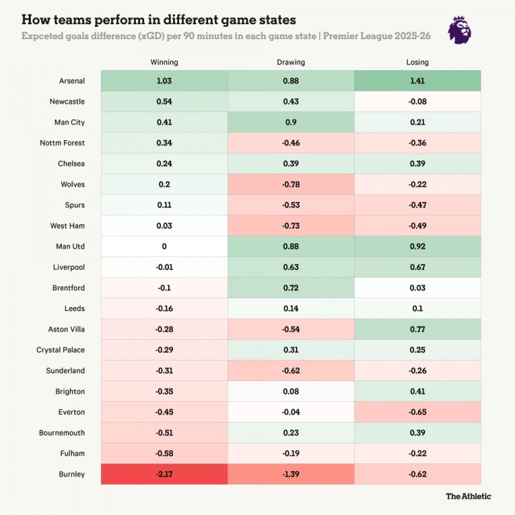 曼联还展现了阿莫林时代少见的一种品质:领先后的淡定。下图显示,曼联在落后时的预期进球差排英超第二,平局时并列第二,但一领先反而不会踢了。